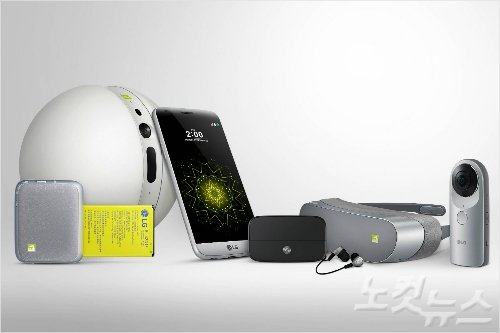 LG전자가 21일(현지시간) 스페인 바르셀로나에서 열리는 MWC 개막 하루 전, LG G5와 LG 프렌즈를 공개했다. 왼쪽부터 카메라 그립 모듈 ‘LG 캠 플러스’, 홈 모니터링 카메라 ‘LG 롤링봇’, 전략 스마트폰 ‘LG G5’, 포터블 DAC 모듈 ‘LG 하이파이 플러스’, 하이엔드 이어폰 ‘H3 by B&O PLAY’, 모바일 전용 VR 기기 ‘LG 360 VR’, 360도 카메라 ‘LG 360 캠’ LG전자 제공