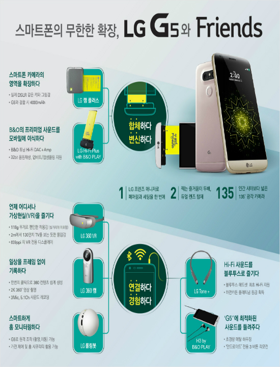G5의 '모듈 방식’은 세계 최초로, 다양한 디바이스를 연결, 고객들에게 상상하지 못했던 즐거운 경험을 제공하겠다는 포부다. '친구들'과 결합으로 스마트폰 스크린을 넘어서는 경험을 확장하고 '놀이문화'를 구축, '모바일 에코시스템' 확립에 나선다.