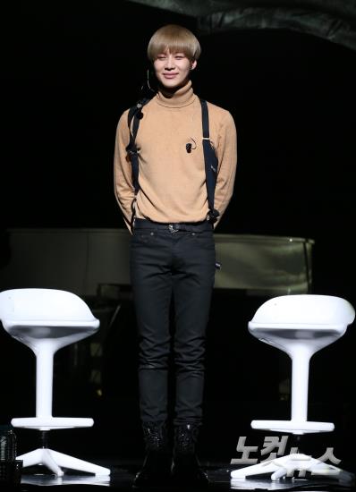그룹 샤이니의 멤버 태민이 22일 오후 서울 삼성동 코엑스 아티움 SM타운 씨어터에서 열린 첫 정규앨범 'Press It' 쇼케이스에서 인사말을 하고 있다.