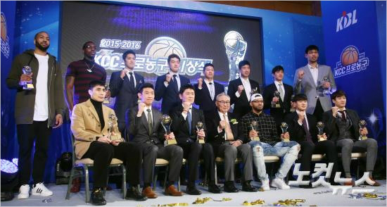 22일 오후 서울 반포동 JW메리어트 호텔에서 열린 ‘2015-2016 KCC 프로농구 시상식’에서 수상자들이 기념촬영을 하고 있다 (사진=노컷뉴스 황진환 기자 jordanh@cbs.co.kr)