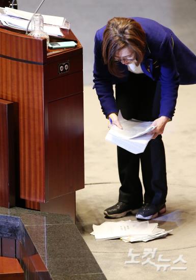 더불어민주당 은수미 의원이 24일 오전 서울 여의도 국회본회의장에서 테러방지법 본회의 의결을 막기 위한 무제한 토론(필리버스터)을 하고 있다. 은 의원은 이날 오전 2시 30분부터 발언을 시작해 현재(24일 오전 11시 45분)까지 발언을 이어가고 있다.