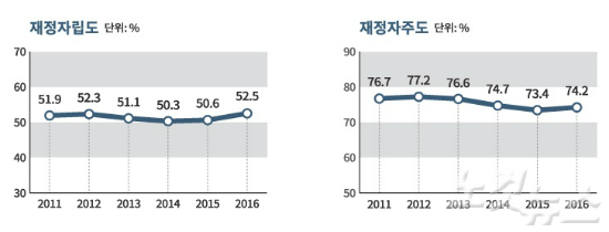 특히 재정자립도는 52.5%로 전년의 50.6%보다 1.9% 포인트 상승하면서 2011년 이후 5년만에 최고치를 기록했다.