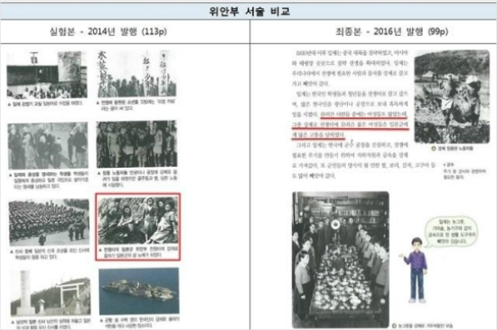 하지만 막상 학교 현장에 배포될 최종본 교과서에는 사진과 사진설명이 사라진 대신 "강제로 전쟁터에 끌려간 젊은 여성들은 일본군에게 많은 고통을 당하였다"고 두루뭉수리하게 적어놓은 것.