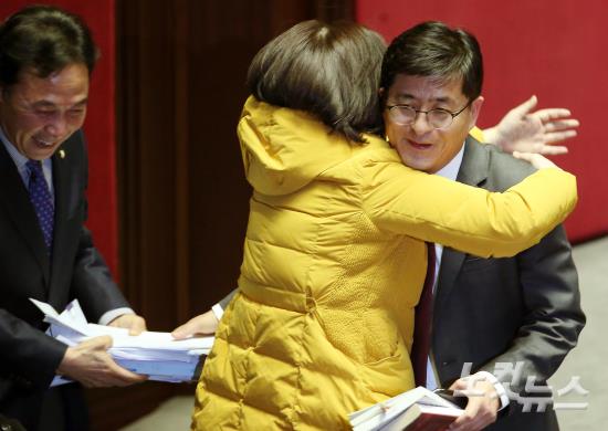 정의당 박원석 의원이 24일 오전 서울 여의도 국회본회의장에서 테러방지법 본회의 의결을 막기 위한 무제한 토론(필리버스터)을 마친 뒤 심상정 대표의 격려를 받고 있다.