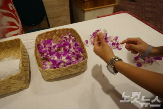꽃잎을 이용해 레이를 만들고 있다. (사진=허니문리조트 제공)