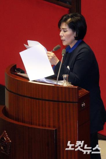 최민희 더불어민주당 의원이 25일 오전 국회 본회의장에서 테러방지법 본회의 의결을 막기 위한 필리버스터(무제한 토론을 통한 합법적 의사진행 방해)를 하고 있다