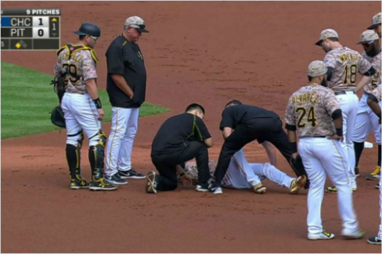 '아 코글란' 지난해 9월 18일 시카고 컵스 크리스 코글란의 거친 태클에 골절상과 인대 파열 등 중상을 입고 쓰러진 피츠버그 강정호.(사진=메이저리그 홈페이지 캡쳐)