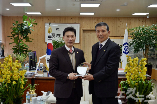 박진성 순천대 총장(왼쪽)이 성산요양원으로부터 감사패를 받고 있다(사진=순천대)