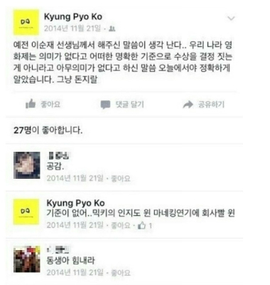고경표로 추측되는 인물은 SNS에 "예전 이순재 선생님께서 해주신 말씀이 생각난다. 우리나라 영화제는 의미가 없다고. 어떤 기준으로 수상을 결정 짓는 게 아니여서 아무 의미가 없다고 하신 말씀"이라는 글을 게재했다. 이어 그는 "오늘에서야 정확하게 알았다. 그냥 돈XX"라고 덧붙였다.