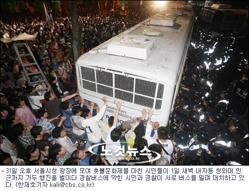 30일 밤부터 1일 아침까지 이어진 미 쇠고기 수입 반대 집회에 경찰특공대가 투입됐다. 경찰은 거리 시위에서의 충돌이 격화되면서 경찰특공대를 전격 투입했다고 밝혔다.