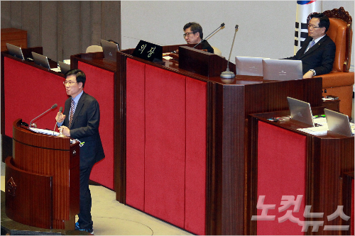 더불어민주당 신경민 의원이 25일 오후 국회 본회의장에서 테러방지법 본회의 의결을 막기 위한 필리버스터를 하고 있다. 윤창원기자