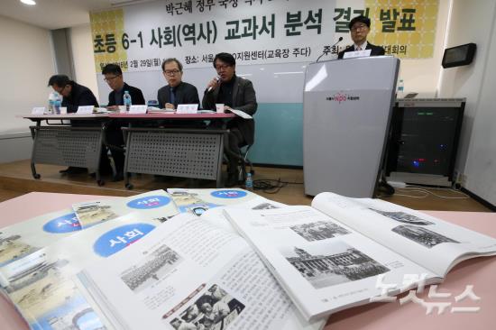 29일 오전 서울 중구 NPO지원센터에서 박근혜 정부의 국정 역사교과서인 '초등 6-1 사회(역사)교과서' 분석결과가 발표되고 있다. 역사교육연대회의는 이날 교과서 분석결과 비문, 부적절한 표현 등 오류라고 할 수 있는 내용이 93개, 편향성을 띤 내용이 31개로 총 124개의 문제가 있다고 밝혔다.