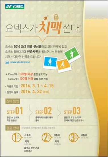 요넥스는 지난 1일부터 4월 15일까지 열리는 '요넥스가 치맥 쏜다' 이벤트에 들어갔다. 배드민턴 클럽 중 클래스(Class) 1부(100명 이상의 클럽 응모 가능)와 2부(100명 이하의 클럽 응모 가능)로 나눠 응모가 진행된다.
