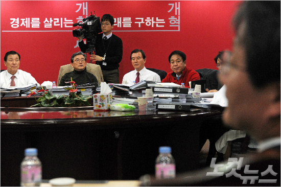 새누리당 이한구 공천관리위원장과 위원들이 지난달 26일 오전 서울 여의도 당사에서 열린 대구 동구 을 지역 공천신청자에 대한 면접에서 유승민 예비후보를 응시하고 있다. (사진=윤창원 기자/자료사진)