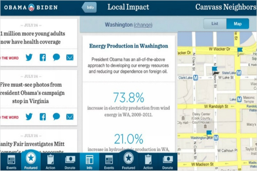 특히 2012년 대선 당시 오바마 '앱'(app)이 오바마를 대통령 자리에 앉혔다고 해도 과언이 아니다. 미국에서는 특정 정당의 당원으로 등록하면 그 사람의 이름과 주소가 대중에게 공개되는데 오바마 앱은 이를 이용, 다운로드 받은 사람의 GPS를 파악해 스마트폰 소지자 주변에 있는 민주당원의 목록, 그리고 설득 가능해 보이는 공화당원의 이름과 주소를 제공한다.