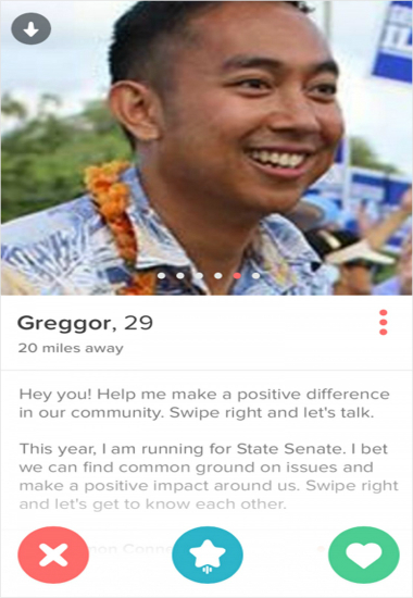 빅 아일랜드 카운티의원 선거에 나선 그레고르 이아간(29)은 데이팅 앱으로 유명한 '틴더'로 지지자 결집에 나섰지만, 의도와는 달리, 정치를 핑계로 진짜 데이트를 원하는 이성들이 접근, 본질이 흐려지면서 이 방식을 포기했다.