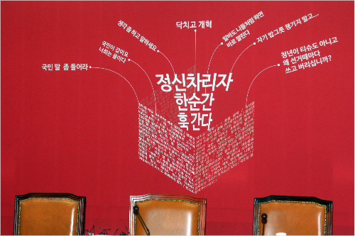 지난달 29일 국회 새누리당 최고위원회의가 열리는 당대표 회의실의 백보드 글귀가 당 페이스북을 통해 공모한 네티즌의 쓴소리로 바뀌어져 있다. (사진=윤창원 기자)