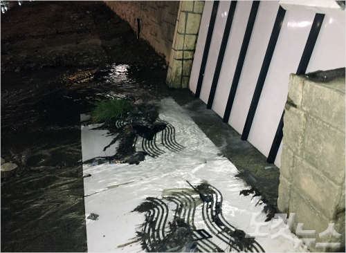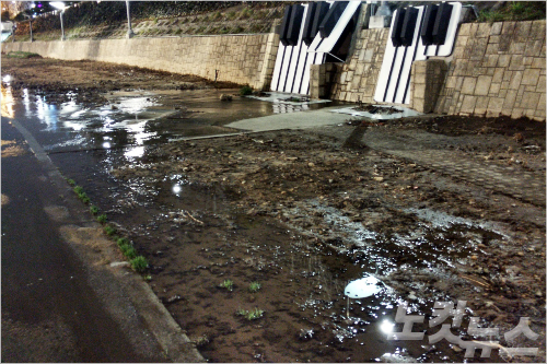 뚜껑 사이로는 온천천으로 흘러가야 할 하수가 산책로에 '콸콸' 소리를 내며 쏟아져 나온다.