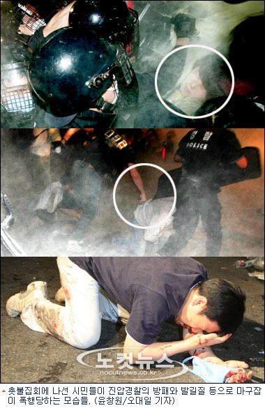여기다 2일 새벽 1시쯤 서울 세종로 사거리에서 경찰과 시위대의 대치상황을 취재하던 KBS 영상취재팀 신모 기자가 전경이 휘두른 폭력에 왼쪽 눈 실핏줄이 터지고 눈 주위가 시퍼렇게 멍드는 전치 2주의 상처를 입었다.