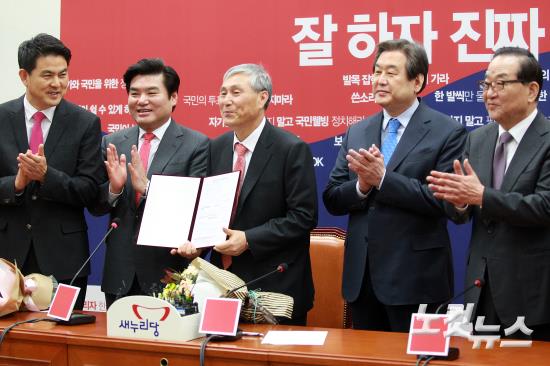 한국 바둑의 전설 조훈현 9단(가운데)이 10일 오전 국회에서 열린 새누리당 최고위원회의에 참석해 입당식을 가지며 김무성 대표, 원유철 원내대표 등으로부터 축하의 박수를 받고 있다.