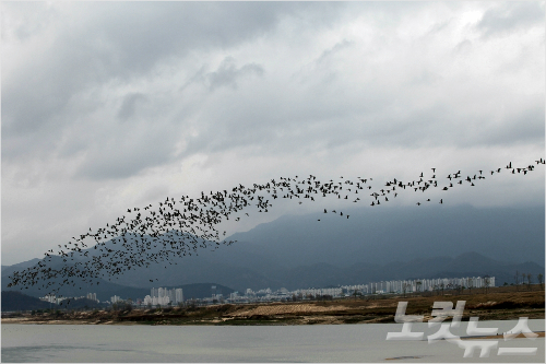 구미시는 지난해 10월부터 이달 9일까지 이곳을 모니터링 한 결과 흑두루미 1천120마리, 재두루미 388마리, 큰고니 646마리, 청둥오리 6천100마리, 쇠기러기 7천500마리 등 총 1만 6천여 마리가 찾아왔다고 14일 밝혔다