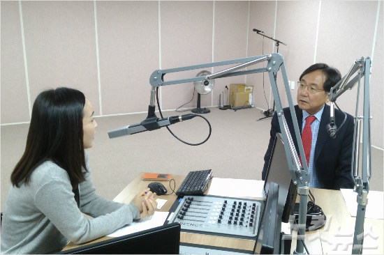 강원CBS 원주방송센터에서 진행한 '시사포커스 박윤경입니다'에 출연해 성과와 목표를 밝히고 있는 손명세 심평원장(오른쪽).(사진=강원CBS 박정민 기자)