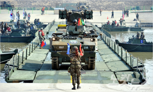 16일 오전 경기도 이천 육군 7공병여단 도하훈련장에서 한미 연합 도하훈련을 했다. 한미 공병부대가 연합작전으로 설치한 부교를 통해 장갑차 (K200)가 신속히 도하하고 있다.(사진=육군제공)