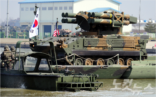 16일 오전 경기도 이천 육군 7공병여단 도하훈련장에서 한미 연합 도하훈련을 했다. 한미 공병부대가 연합작전으로 설치한 부교를 통해 저고도 지대공 미사일 천마 (K-SAM)가 신속히 도하하고 있다.(사진=육군제공)