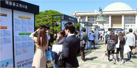 지난해 10월 여의도 국회에서 열린 대한민국 청년 20만 창조일자리 박람회에사 청년 구직자들이 채용 공고를 확인하고 있다. 윤창원기자