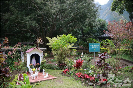 케파니와이 공원 앤 헤리티지 가든에 위치한 포르투갈 가든. 성모상과 함께 아기자기한 꽃밭이 인상적이다.(사진=허니문리조트 제공)