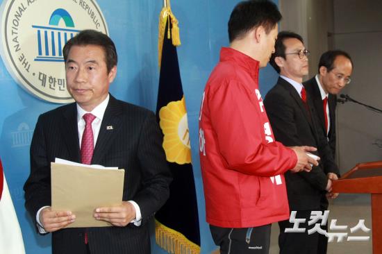 정종섭(대구 동구갑) 예비후보 등 새누리당 김무성 대표가 무공천을 선언한 지역구 후보들이 25일 오전 국회 정론관에서 김 대표의 의결 거부를 규탄하는 기자회견을 가진 뒤 회견장을 나서고 있다.