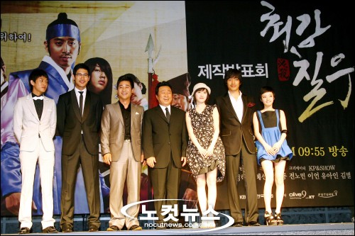[BestNocut_R]4일 오후 서울 종로구 세종로 KT아트홀에서 열린 KBS2 TV 월화드라마 ''최강칠우''(연출 박만영, 극본 백운철) 제작발표회에서 (왼쪽부터) 유아인, 이언, 전노민, 임하룡, 구혜선, 문정혁, 김별이 취재진을 향해 포즈를 취하고 있다.