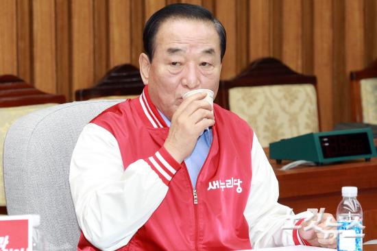 29일 오전 국회에서 열린 새누리당 첫 중앙선거대책위원회의에서 서청원 최고위원이 물을 마시고 있다.