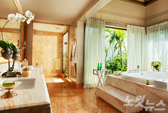 111개의 객실마다 워터젯 욕조와 고급 비품들을 진열한 욕실은 럭셔리 그 자체다. 욕실바닥은 밝은 톤의 화산석으로 마감했고 두 개의 세면대마저 범상치 않는 기품이 살아 있다.