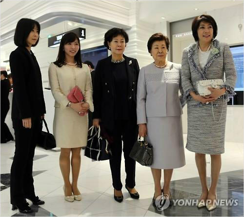 일본 도쿄에서 31일 열린 롯데면세점 긴자점 개점 행사에 롯데 가문 여인들이 대거 모였다. 사진 오른쪽부터 왼쪽으로 신동빈 롯데그룹 회장의 부인 시게미쓰 마나미(重光眞奈美, 57) 여사, 어머니 시게미쓰 하쓰코(重光初子, 89) 여사, 누나 신영자(74) 롯데복지재단 이사장, 며느리 시게미쓰 아야(重光絢, 32) 씨, 신 이사장 딸 장선윤(45) 호텔롯데 해외사업개발담당 상무.