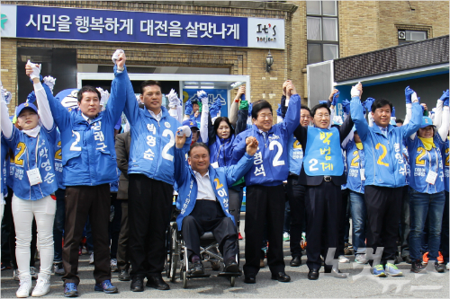 이인제 공동위원장은 "지난 4년 동안 더민주는 국회선진화법을 방패로 삼아 사사건건 발목을 잡고 개혁을 저지했다"며 "이런 정당이 경제 위기를 해소하고 희망을 만들 수 있겠느냐. 나라와 대전의 희망을 위해 새누리당을 선택해 달라"고 호소했다.