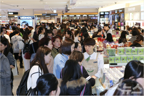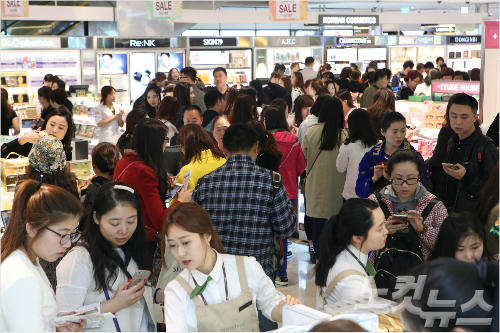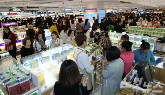 역시 국산 화장품 코너에 사람이 가장 많이 몰렸다. 신라아이파크면세점은 이틀간 20억원의 매출을 올릴 것으로 기대하고 있다.