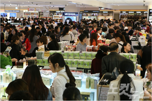 아오란그룹 임직원 6천여명은 전날에 이어 1일도 용산 신라아이파크 면세점과 여의도 갤러리아면세점63을 대거 방문했다.