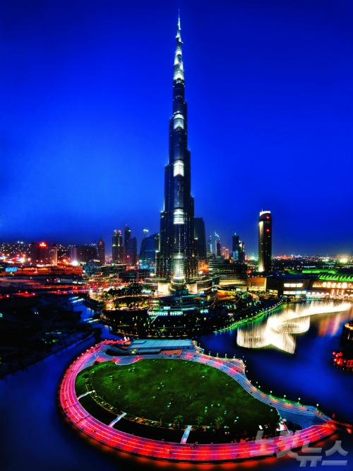 ◇ 두바이 야경의 그 끝, 부르즈 할리파높이 828m에 126층 건물로 세계에서 가장 높은 타워다. 삼성물산이 시공하면서 우리나라 사람들에게 꽤 알려진 건물이다. 면적은 50만㎡로 국내 코엑스 몰의 4배, 잠실종합운동장의 56배이며, 초속 55m 바람과 규모 7의 지진도 견딜 수 있게 설계되었다.