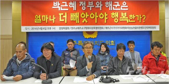 강정마을회와 제주군사기지저지범도민대책위원회는 6일 제주도의회 도민의방에서 기자회견을 열어 "강정주민들로부터 무엇을 얼마나 더 빼앗아야 박근혜 정부와 해군은 행복하겠느냐"고 따졌다.
