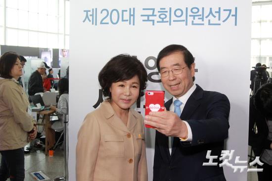 박원순 서울시장과 부인 강난희씨가 제20대 국회의원선거 사전투표날인 8일 오전 서울역 맞이방에 설치된 남영동 사전투표소에서 투표를 마치고 인증샷을 찍고 있다.