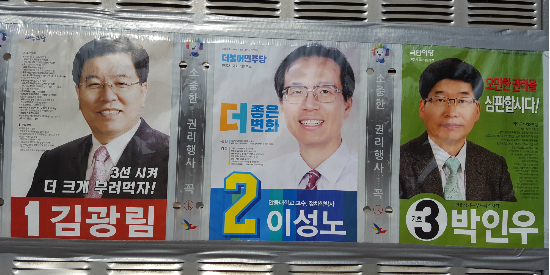 이에 맞서 더불어미주당 이성노 후보는 '더 놓은 변화'를, 그리고 국민의당 박인우 후보는 '오만한 권력 심판'을 각각 기치로 내걸고 선거전을 펼치고 있다.