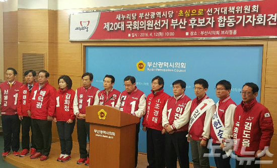 새누리당 부산시당 선거대책위원회(위원장 김정훈)는 12일 오전 부산시의회에서 기자회견을 갖고 지지를 호소했다. (사진=부산CBS 조선영 기자)