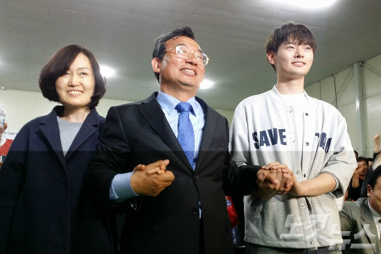 새누리당 이정현 의원이 가족과 손을 잡은 채 밝은 표정을 짓고 있다 (사진=고영호 기자)