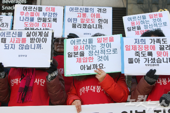 엄마부대와 탈북엄마회 등 보수단체 회원들이 지난 1월 4일 오후 서울 마포구 한국정신대문제대책협의회 앞에서 기자회견을 열고 정대협과 일본군 위안부 피해 할머니들에게 한일 위안부 협상 결과를 받아들일 것을 요구하고 있다. 윤창원기자