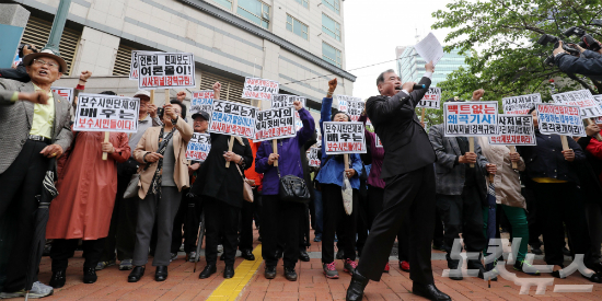 대한민국어버이연합 회원들이 21일 오후 서울 용산구 시사저널사 앞에서 올해 초 위안부 타결과 관련해 청와대 측에서 지지 집회를 지시받았으나 이를 거부했다는 '시사저널'의 보도는 오보라고 주장하며 반박 기자회견을 하고 있다. 박종민기자