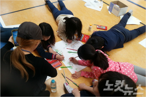 체육관에서 생태지도를 만들고 있는 봉대초등학교 학생들