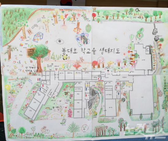 봉대초등학교 5, 6학년 학생들이 조사를 통해 직접 그린 학교 생태지도.