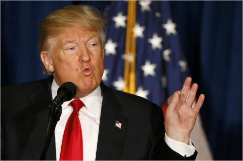 미국 공화당 대선 경선 선두주자인 도널드 트럼프가 27일(현지시간) 워싱턴DC 메이플라워 호텔에서 외교 정책 구상을 밝히는 연설을 하고 있다 (사진=연합뉴스)