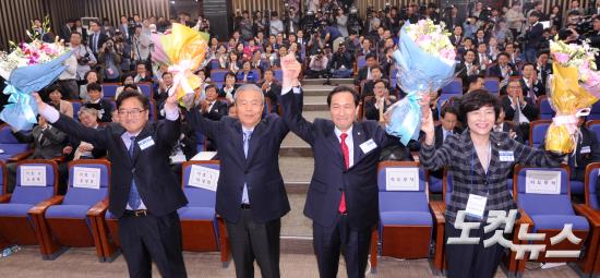 4일 오후 서울 여의도 국회에서 열린 제20대 국회 더불어민주당 제1기 원내대표 선출을 위한 의원총회에서 신임 원내대표로 선출된 우상호 의원이 김종인 비대위 대표와 손을 들어 포즈를 취하고 있다. (왼쪽부터) 우원식 의원, 김종인 대표, 우상호 신임 원내대표, 김영주 선거관리위원장.